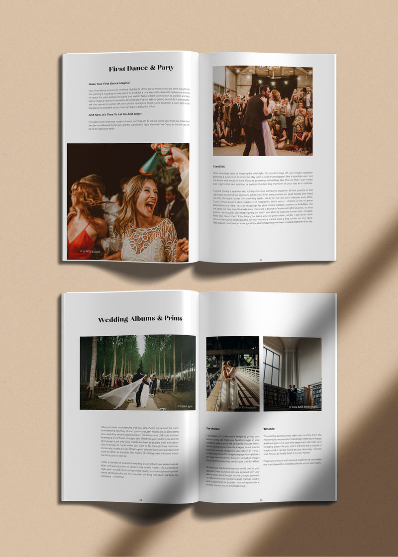 The guide covers all parts of the journey your couples will have with you. From the planning stage to the delivery of their final gallery. From the getting ready all the way to the sparkler exit.